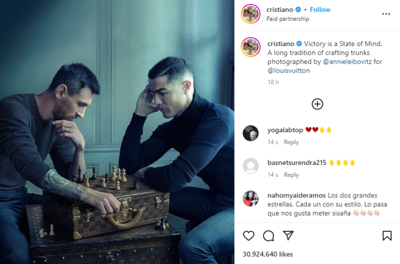 Во рекламата, Роналдо и Меси, кои се натпреваруваат за своите репрезентации на Светското првенство во Катар, играат шах и се потпираат врз куфери на модниот бренд „Луј Витон“.