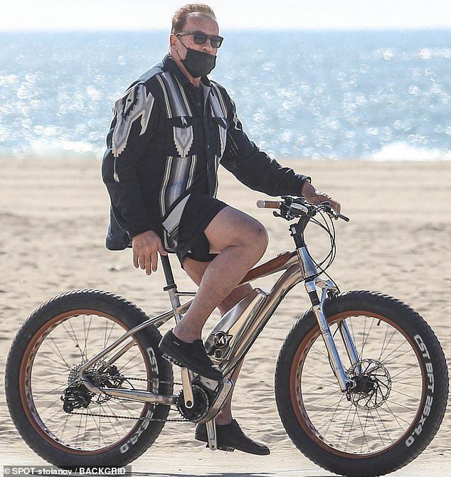 73-годишниот поранешен гувернер на Калифорнија ги покажа мускулестите нозе додека се движеше по велосипедската патека на плажата Вил Роџерс. Терминаторот се погрижи да преземе мерки на претпазливост и заштита со носење маска на лицето во тек на пандемија на коронавирусот.