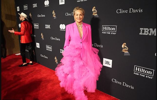 Шерон Стоун ги привлече сите погледи на себе кога пристигна на годишната гала на Клајв Дејвис, која традиционално се одржува во Лос Анџелес еден ден пред доделувањето на Греми-наградите.