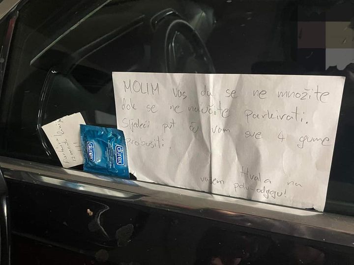 „Ве молам, не се множете додека не научите да паркирате. Следниот пат ќе ги дупнам сите четири гуми. Ви благодариме за полуобразованието”, му напишал некој, оставајќи кондом до листот закачен на прозорецот.