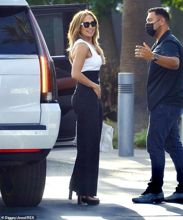 Џенифер Лопез изгледа среќно, насмеана од уво до уво додека влегува на деловен состанок во своите канцеларии во Вест Холивуд.