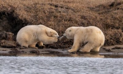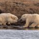 Две поларни мечки биле снимени како се борат на парчиња пластика што ги пронашле на речен брег во оддалечен предел на Алјаска. Младенчињата биле забележани како...