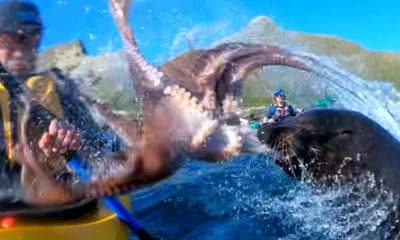 Кајакар доби лигава шлаканица по лицето од фока во водите на Каиокура, Нов Зеланд. Фоката веројатно се борела со октоподот за да го улови кога наишол кајакот....
